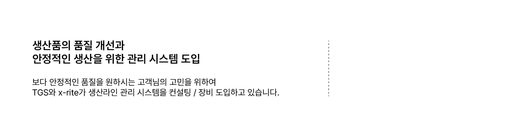•생산 품질의 안정적 확대 및 품질개선을 위하여 생산 라인 위에 라인용 색차계를 설치 추가적인 소프트웨어 연결을 통해 생산팀에서 즉각적으로 제품의 품질을 PASS / FAIL로 확인 할 수 있도록 현장 세팅하였습니다.